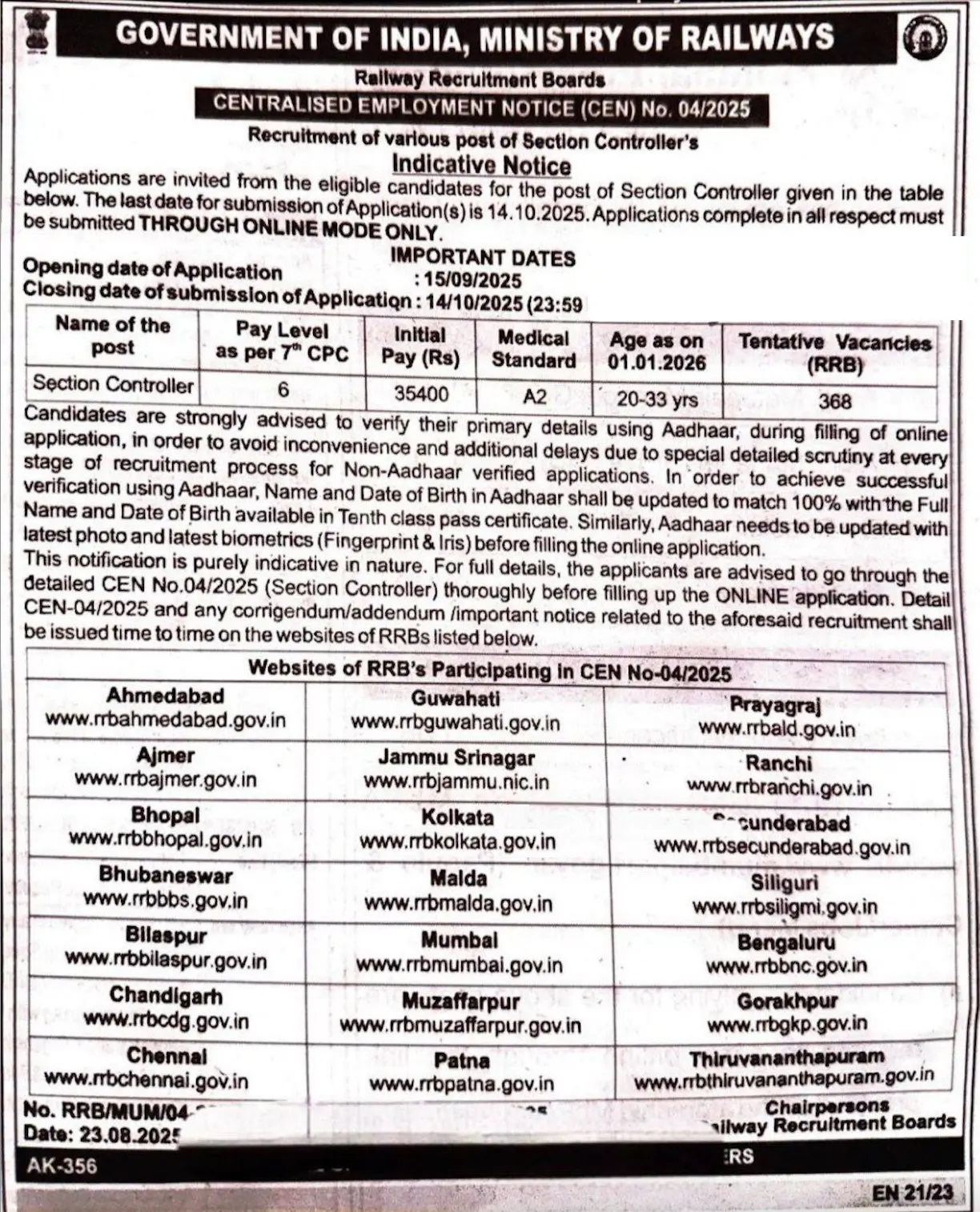 Interested Candidate Can Read the Full RRB Section Controller Notification Before Apply Online.